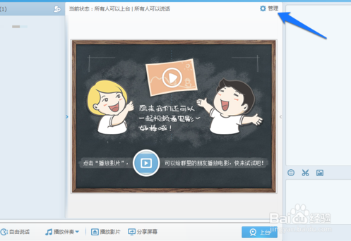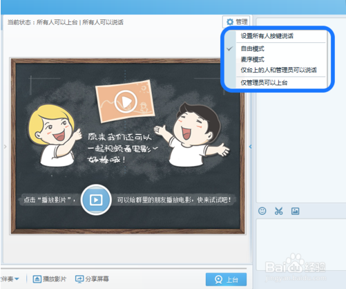 如果你是群視頻的發(fā)起人,你還可以管理群視頻,點(diǎn)擊“管理”按鈕,如圖所示
