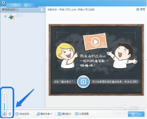 把鼠標(biāo)指向左下角的“話筒或喇叭”圖標(biāo),會(huì)出現(xiàn)音量調(diào)節(jié)滑塊,可以調(diào)整說(shuō)話和音量的大小,如圖所示