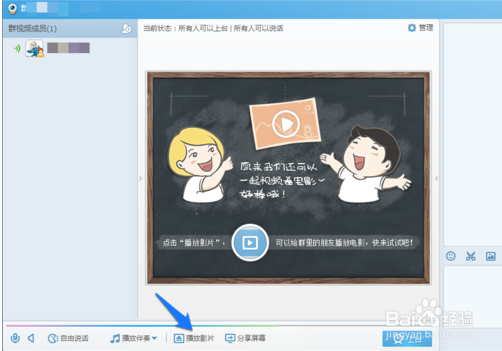 另外我們還可以在群視頻中分享電腦上的音樂(lè)或視頻,這里以分享視頻為例,點(diǎn)擊“播放影片”按鈕,如圖所示
