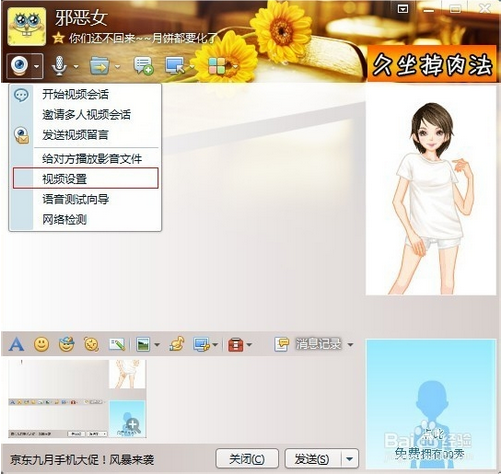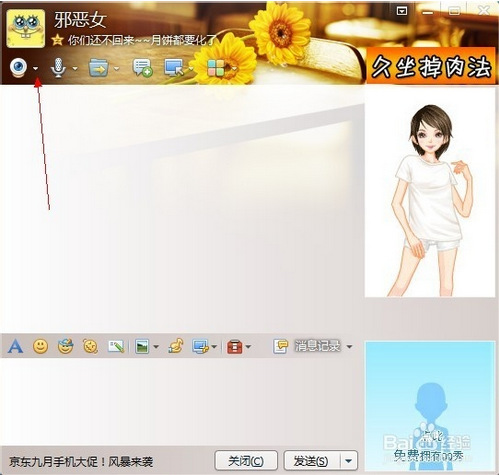 1.隨便找一個QQ好友,打開聊天窗口,在聊天窗口的左邊找到視頻圖標,注意視頻圖標旁邊的小三角,沒錯,就是它,點開