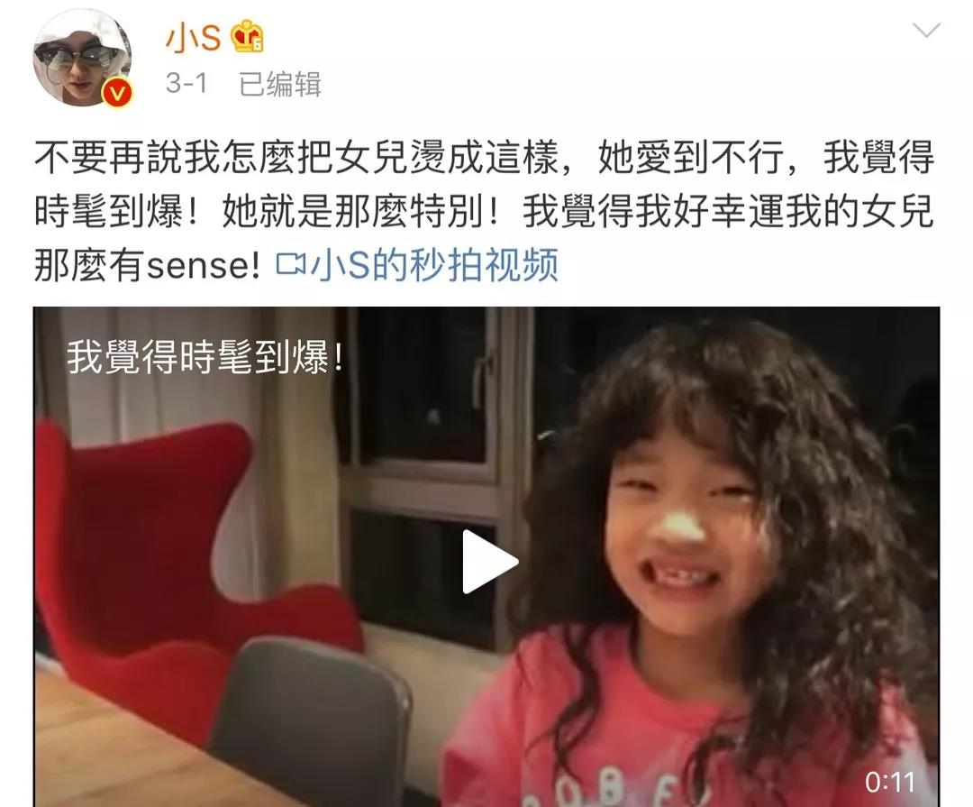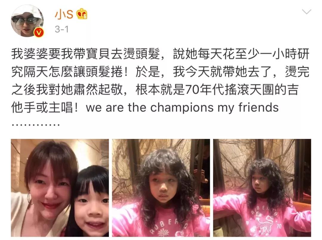 前陣子,小S發(fā)了條微博,說(shuō)7歲的許老三最近沉迷卷發(fā),奶奶發(fā)現(xiàn)她每天至少要花1小時(shí)研究,怎么讓自己的頭發(fā)變卷,于是索性讓小S帶她去燙個(gè)頭。