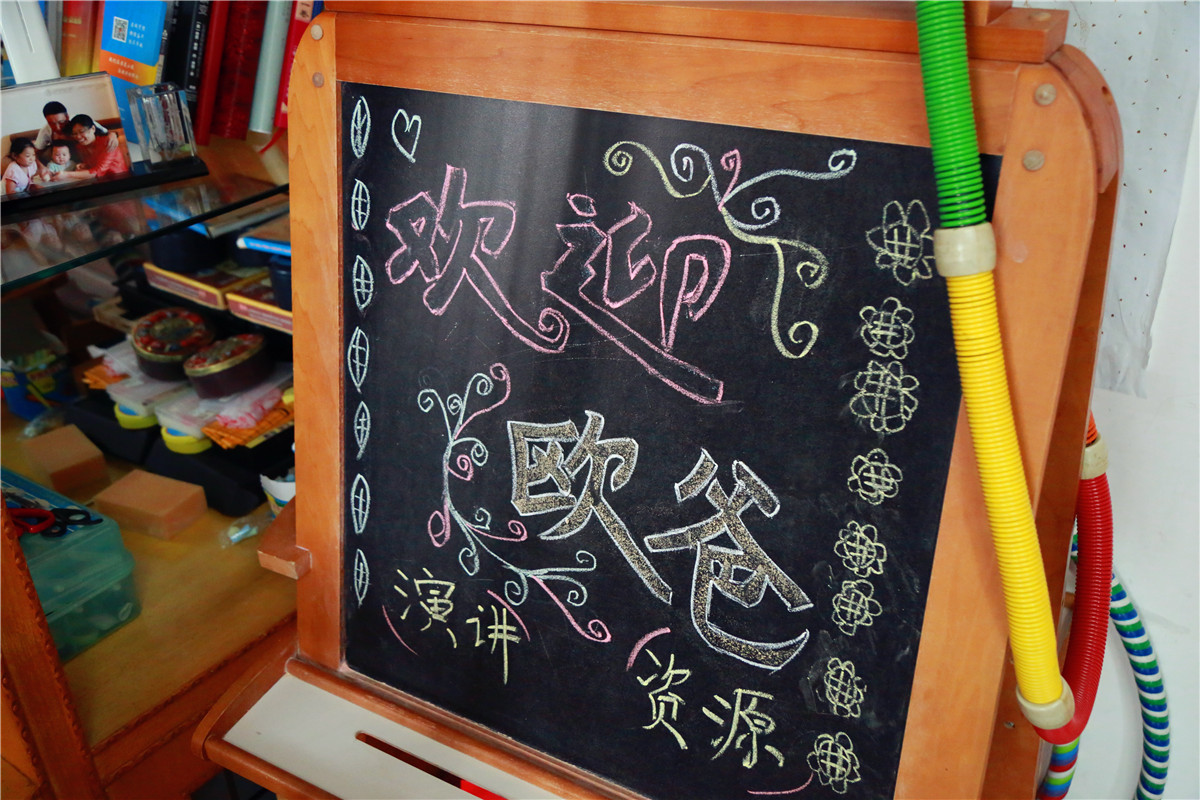 進到屋中里,門口就擺著一個小黑板,上面用漂亮的粉筆字寫的“歡迎歐爸”,下面不忘加上歐爸時常教導的“演講”和“資源”。原來家里的孩子想好好表達對歐爸的思念,親自和爸爸媽媽一起動用資源完成了這個小黑板畫!