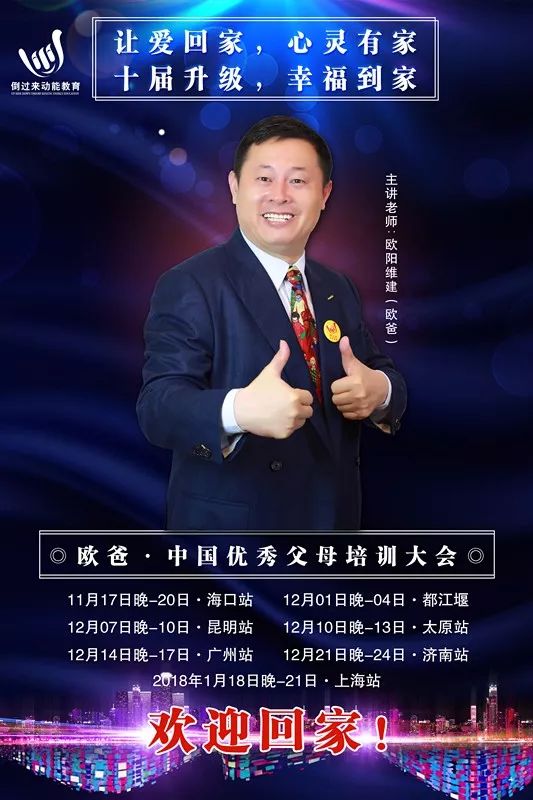 于是,就有了歐爸主講的【歐爸·中國優(yōu)秀父母培訓(xùn)大會】!讓愛回家,讓孩子心靈有個家,【歐爸·中國優(yōu)秀父母培訓(xùn)大會】——歡迎全國父母們回家!