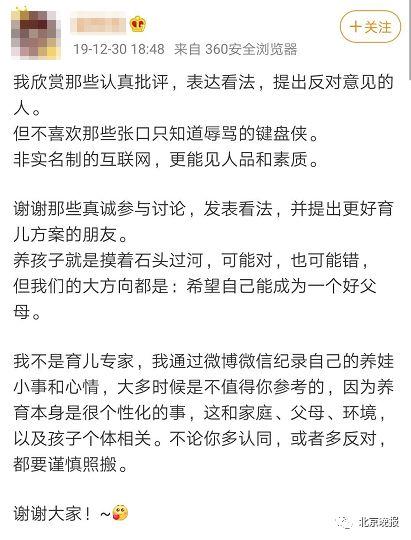 粥悅悅在事件發(fā)生之后發(fā)微博道歉,但是她同時也表示:“養(yǎng)育本身是很個性化的事,這和家庭、父母、環(huán)境,以及孩子個體相關(guān)。”