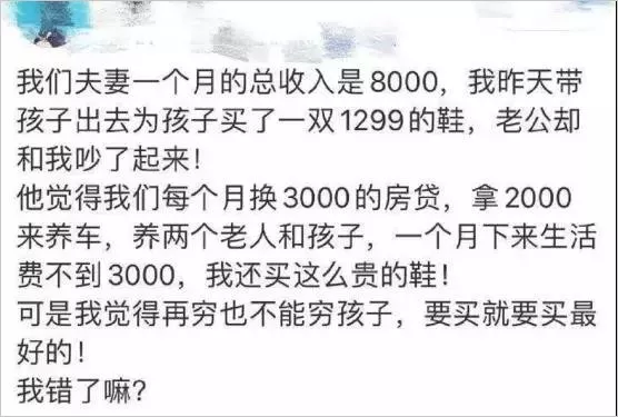 一位媽媽因?yàn)榻o兒子買(mǎi)了一雙1299的鞋,和老公發(fā)生了爭(zhēng)吵。