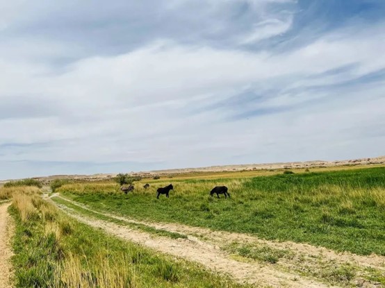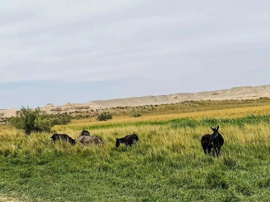 我們在這個無人區(qū)里考察的路線,就是西漢時期張騫出使西域的路線,也是唐朝高僧玄奘西行取經(jīng)的路線。一行人乘車進入這個無人區(qū)后不久,我突然從右邊的車窗外看到,距離車子不到一百米的地方,有兩大一小的野生動物在活動。身旁的司機認出那是國家一級保護動物——黃羊。司機開心地說:“歐爸你太幸運啦,我們來過好多次都沒有看到過,你今天一來就看到了。”