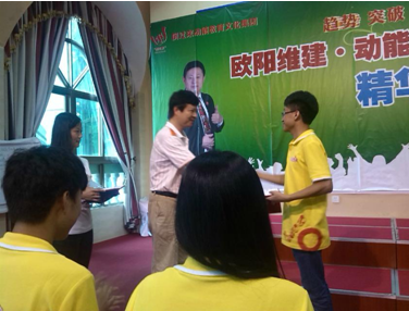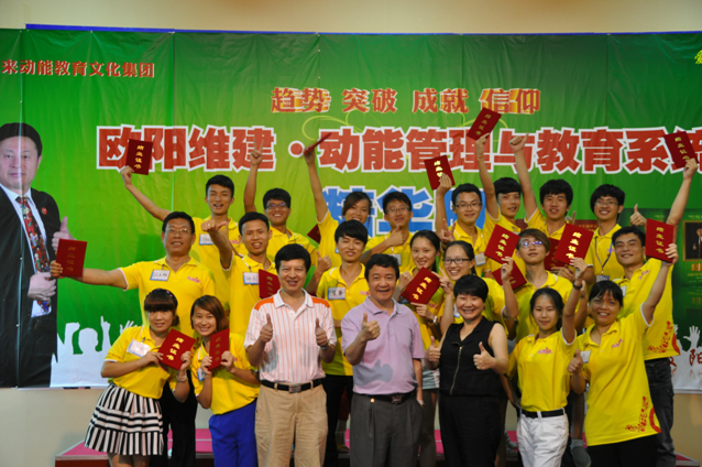 面對這樣的“大家”,我不敢眨眼,認認真真,戰(zhàn)戰(zhàn)兢兢地聽歐爸說的每一句話。散會后,大皖姐說我們真的是太幸運了,剛來就有幸能夠上歐爸演講之道的三天課程。當時,我也覺得我很幸運,來的第二天就見到了歐爸,親眼目睹了歐爸的風采,心里頓時從對歐爸陌生到接受到喜歡并且真正的崇拜。三天下來,感受到最多的是歐爸的親力親為,歐爸的拼命,歐爸的感動。在“信仰成就未來--歐陽維建動能演講暨苦樂營父母大學”開課的最后一天晚上,能量場里的所有人都為之感動。
