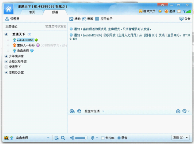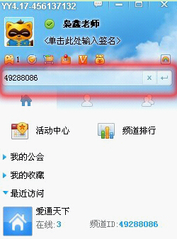 第5步:在這個(gè)小框里輸入YY群ID號:49288086,回車,就進(jìn)入愛通天下YY愛心電臺了,還可以互動的喲?。?!