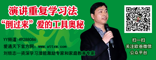 2013年11月8日星期五19:30~21:00,“倒過來”愛的動(dòng)能教育網(wǎng)絡(luò)學(xué)堂將在YY語音平臺(tái)舉行,本期我們邀請到了著名教育家、演講家、策劃家、青少年潛能激勵(lì)專家歐陽維建老師的弟子,資深學(xué)習(xí)潛能激勵(lì)專家和家庭教育專家劉劉鎖志為我們講解《愛能贏·合格父母考級(jí)教材》(中小學(xué)版)第十篇:演講重復(fù)學(xué)習(xí)法——“倒過來”愛的工具奧秘,敬請留意、敬請關(guān)注,多謝轉(zhuǎn)發(fā)!