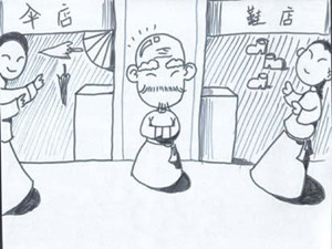 禪師聽罷,脫口便說:你“倒過來”想想,下雨的時候,你要想賣傘的女兒生意好,天晴的時候你要想賣鞋的女兒賣得好,這樣你就自然不會哭了。聽了禪師的一番話,老太太頓悟。從此,街頭便有了一個總是樂呵呵的“笑婆婆”。