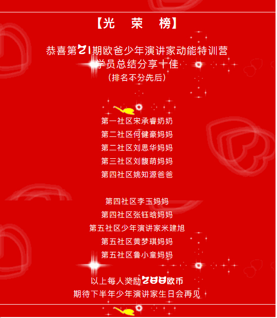 下面是歐爸動(dòng)能教育總部評(píng)選的第21期歐爸少年演講家動(dòng)能特訓(xùn)營(yíng)學(xué)員總結(jié)分享十佳名單:
