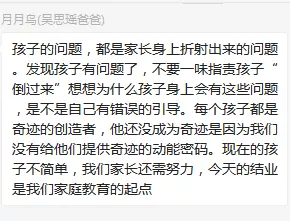 家長(zhǎng)的一言一行、家長(zhǎng)對(duì)待學(xué)習(xí)的態(tài)度都深深地影響到孩子,“言傳身教”是最偉大的一種教育力量。