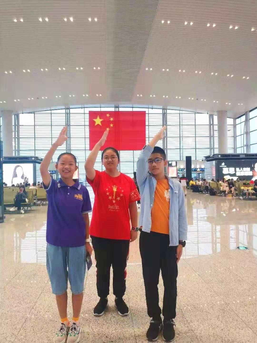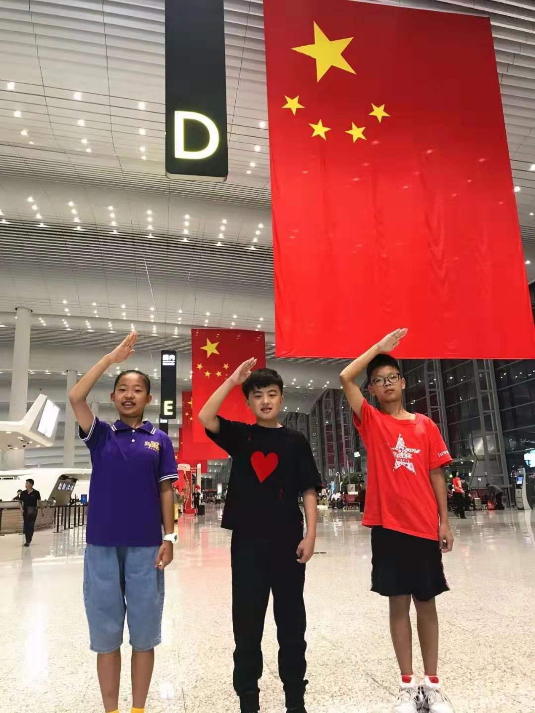 回程路上,熙媛、昕蔚、延巖、婧妍、冠鑫這幾位少年演講家,在廣州白云機(jī)場自覺地向國旗行少先隊(duì)禮,合影留念。昕蔚還特別穿上了一件印有紅心的上衣,寓意祖國在我心中。