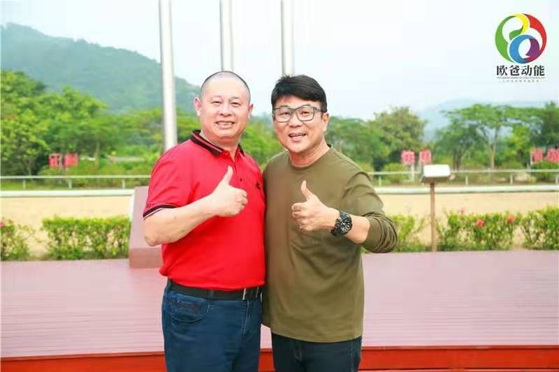 歐陽維建老師(歐爸)和梁志強(qiáng)導(dǎo)演,在廣州歐爸動(dòng)能親子研學(xué)基地旗臺(tái)前合影