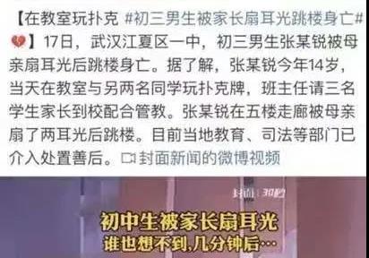 張某的母親到校后,在溝通和管教中扇了他兩耳光,幾分鐘后,張某跳樓身亡。