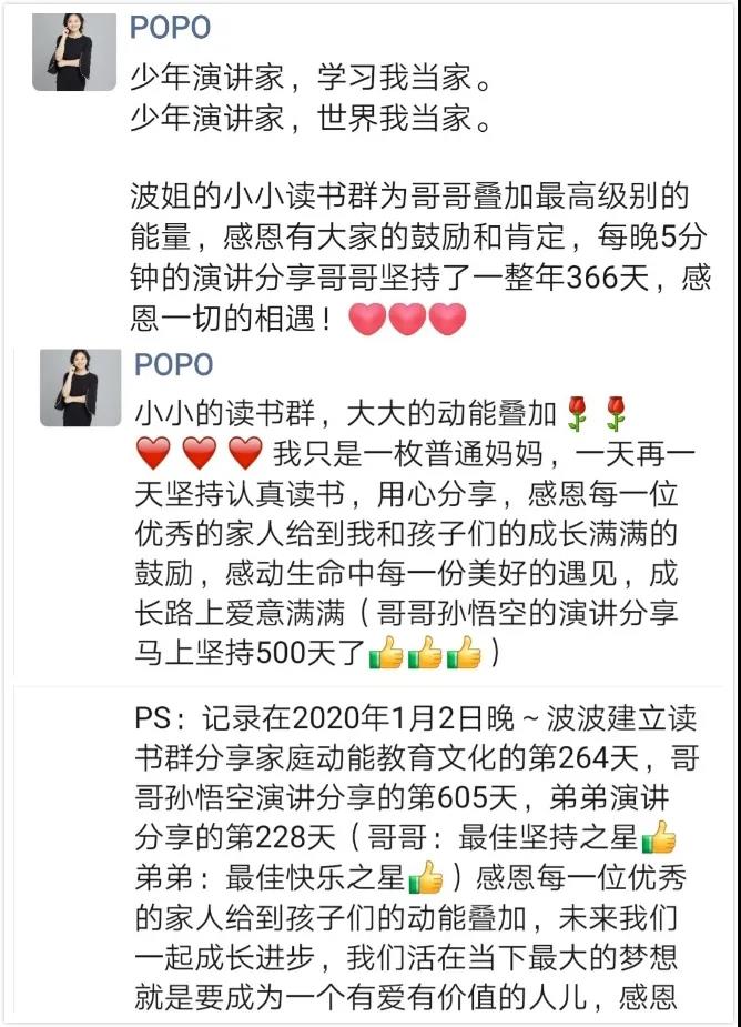 波波老師發(fā)現(xiàn),通過(guò)動(dòng)能演講學(xué)習(xí)法堅(jiān)持到現(xiàn)在第1118天,哥哥(動(dòng)能名孫悟空)由原本文靜的內(nèi)向性格到現(xiàn)在外向型,隨時(shí)能夠自信走上舞臺(tái)的狀態(tài)。學(xué)習(xí)習(xí)慣,生活習(xí)慣,家務(wù)動(dòng)手能力都在不斷進(jìn)步,13歲已經(jīng)可以做一桌子飯菜,通過(guò)大量閱讀,參加周末親子活動(dòng),作文水平不斷的提高,前兩周在學(xué)?,F(xiàn)場(chǎng)作文比賽取得全校一等獎(jiǎng),經(jīng)常有小作文會(huì)發(fā)表。