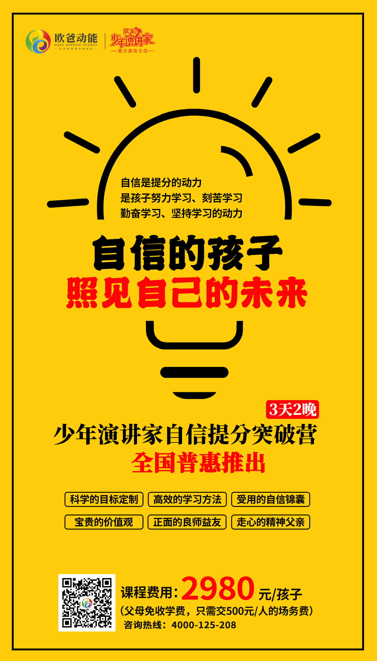 歐爸動能暑期普惠課程【自信提分親子突破營】課程應(yīng)運而生,解決孩子自信不足,分數(shù)不高的問題,讓孩子擁有國家未來人才的核心競爭力——自信,成為未來國家的精英領(lǐng)袖人才。另【自信提分7天陪伴支持系統(tǒng)】正火熱預(yù)定中,更多資訊歡迎撥打熱線:4000125208。