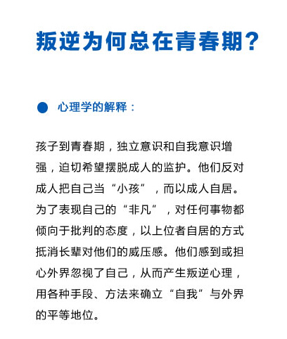青春期孩子的逆反的確會(huì)給孩子們帶來(lái)一定的危險(xiǎn),但是科學(xué)的角度來(lái)看,逆反實(shí)際上是孩子心理成長(zhǎng)的必要階段。如果孩子不經(jīng)歷逆反期,那么他們就無(wú)法長(zhǎng)成一個(gè)有獨(dú)立思維能力的成年人,換句話(huà)說(shuō),太乖的孩子往往會(huì)形成依賴(lài)性人格,對(duì)他們將來(lái)的獨(dú)立生存帶來(lái)更大的危害。... ......詳情