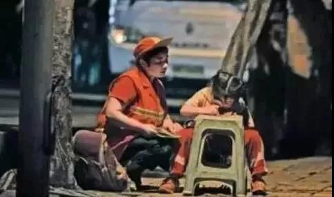 環(huán)衛(wèi)工媽媽在路邊陪孩子寫作業(yè)(圖源:網(wǎng)絡)